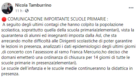 Questo il post pubblicato ieri sera sulla sua pagina Facebook dal Sindaco di Villa Literno Nicola Tamburrino: "Comunicazione importante scuole private. A seguito degli ultimi contagi che hanno colpito la popolazione scolastica, soprattutto quella della scuola primaria(elementari), vista la quarantena di alunni ed insegnanti - si legge nel post - imposta dalla Asl, che sta arrecando molte difficoltà alle Dirigenti scolastiche di poter garantire le lezioni in presenza, analizzati i dati epidemiologici degli ultimi giorni ,di concerto con l’assessore al ramo Franca Mercurio,ho deciso che domani emetterò - continua il post - una ordinanza di chiusura per 14 giorni di tutte le scuole primarie in presenza(elementari). Le scuole dell’infanzia e le scuole medie continueranno la didattica in presenza".