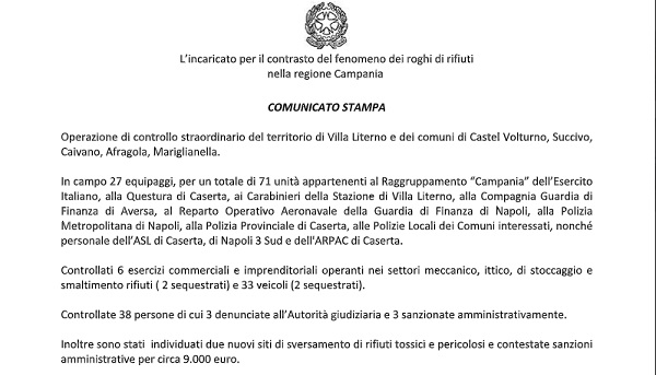 Questo il comunicato inviatoci dall'Ufficio dell'Incaricato per il contrasto del fenomeno dei roghi di rifiuti nella Regione Campania