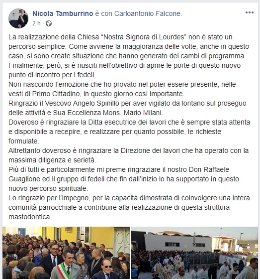 E' stata finalmente inaugurata la chiesa di Nostra Signora di Lourdes a Villa Literno. Questo il commento del Sindaco Nicola Tamburrino