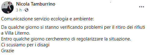 Questo il post pubblicato dal Sindaco di Villa Literno Nicola Tamburrino sulla sua pagina Facebook: "Comunicazione servizio ecologia e ambiente: da qualche giorno si stanno verificando problemi per il ritiro dei rifiuti a Villa Literno. Entro qualche giorno - conclude il post - cercheremo di regolarizzare la situazione. Ci scusiamo per i disagi. Grazie"