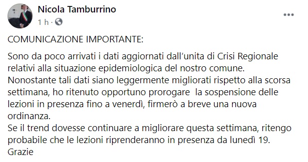 "COMUNICAZIONE IMPORTANTE: Sono da poco arrivati i dati aggiornati dall’unita di Crisi Regionale relativi alla situazione epidemiologica del nostro comune. -Si legge nella nota- Nonostante tali dati siano leggermente migliorati rispetto alla scorsa settimana, ho ritenuto opportuno prorogare la sospensione delle lezioni in presenza fino a venerdì, firmerò a breve una nuova ordinanza. -Si legge nella nota- Se il trend dovesse continuare a migliorare questa settimana, ritengo probabile che le lezioni riprenderanno in presenza da lunedì 19. Grazie"