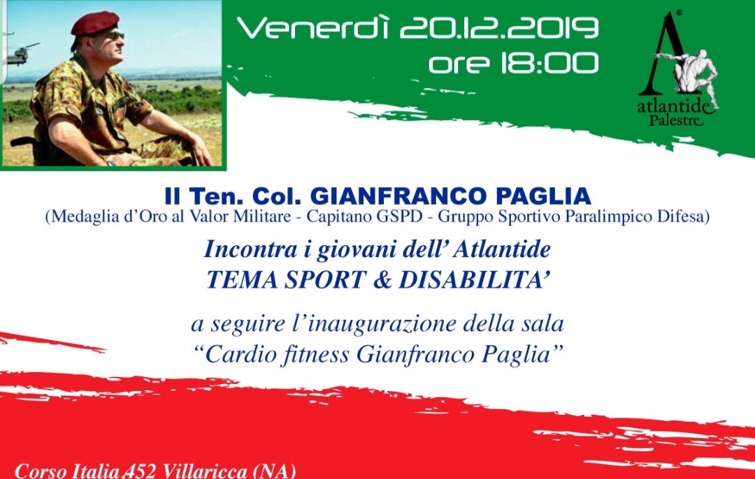 Pubblichiamo questo comunicato stampa: ""Sport e disabilità" sarà questo il tema della conferenza che il Ten. Col. Gianfranco Paglia terrà domani 20 dicembre alle 18 presso la palestra Atlantide di Villaricca. Sarà un momento di confronto per ribadire ancora una volta un concetto basilare - si legge nella nota -, ossia che lo sport aiuta ad abbattere le barriere non solo architettoniche ma soprattutto quelle mentali. La disabilità non è un limite e lo sport unisce davvero tutti senza alcuna differenza. Tutti uniti da un unico credo. Durante l'evento sarà inaugurata la sala cardiofitness dedicata al Ten. Col. Paglia. "Tutto ciò mi inorgoglisce - ha dichiarato Paglia- e consolida un'amicizia con Vincenzo Palumbo, proprietario dell'Atlantide, che dura sin dai tempi del Ceckpoint Pasta. Sono questi valori che vorrei si trasferissero alle nuove generazioni - si legge nella nota -, affinché si comprenda che il vero senso della vita lo si percepisce proprio nello stato del bisogno dove l'aiuto di chi ti sta vicino è così fondamentale che talvolta può anche salvarla."