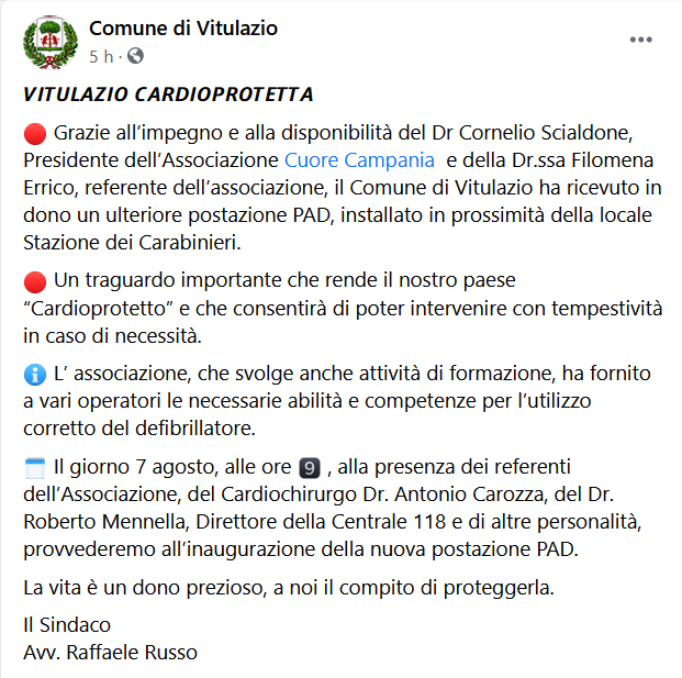 Questo il post pubblicato sulla pagina Facebook del Comune di Vitulazio: "Grazie all’impegno e alla disponibilità del Dr Cornelio Scialdone, Presidente dell’Associazione Cuore Campania e della Dr.ssa Filomena Errico, referente dell’associazione, il Comune di Vitulazio ha ricevuto in dono un ulteriore postazione PAD, installato in prossimità della locale Stazione dei Carabinieri. Un traguardo importante - si legge - che rende il nostro paese “Cardioprotetto” e che consentirà di poter intervenire con tempestività in caso di necessità. L’ associazione, che svolge anche attività di formazione, ha fornito a vari operatori le necessarie abilità e competenze per l’utilizzo corretto del defibrillatore. Il giorno 7 agosto, alle ore 9 - si legge - alla presenza dei referenti dell’Associazione, del Cardiochirurgo Dr. Antonio Carozza, del Dr. Roberto Mennella, Direttore della Centrale 118 e di altre personalità, provvederemo all’inaugurazione della nuova postazione PAD. La vita è un dono prezioso, a noi il compito di proteggerla. Il Sindaco. Avv. Raffaele Russo".