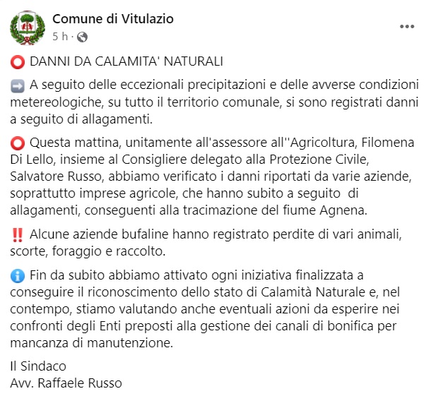 "DANNI DA CALAMITA' NATURALI. A seguito delle eccezionali precipitazioni e delle avverse condizioni metereologiche, su tutto il territorio comunale, si sono registrati danni a seguito di allagamenti. Questa mattina, unitamente all'assessore all''Agricoltura, Filomena Di Lello, insieme al Consigliere delegato alla Protezione Civile, Salvatore Russo, abbiamo verificato i danni riportati da varie aziende, soprattutto imprese agricole, che hanno subito a seguito di allagamenti, conseguenti alla tracimazione del fiume Agnena. Alcune aziende bufaline hanno registrato perdite di vari animali, scorte, foraggio e raccolto. Fin da subito abbiamo attivato ogni iniziativa finalizzata a conseguire il riconoscimento dello stato di Calamità Naturale e, nel contempo, stiamo valutando anche eventuali azioni da esperire nei confronti degli Enti preposti alla gestione dei canali di bonifica per mancanza di manutenzione. Il Sindaco Avv. Raffaele Russo"