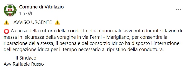Questo quanto apprendiamo dalla pagina fb del Comune di Vitulazio: "AVVISO URGENTE A causa della rottura della condotta idrica principale avvenuta durante i lavori di messa in sicurezza della voragine in via Fermi - Marigliano, per consentire la riparazione della stessa, il personale del consorzio Idrico ha disposto l'interruzione dell'erogazione idrica per il tempo necessario al ripristino della conduttura. Il Sindaco Avv Raffaele Russo".