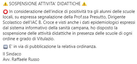 Questo il post pubblicato sulla pagina Facebook 'Comune di Vitulazio': "Sospensione attività didattiche. In considerazione dell'indice di positività tra gli alunni delle scuole locali, su espressa segnalazione della Prof.ssa Presutto, Dirigente Scolastico dell'IAC B. Croce e visti anche - si legge nel post - i dati epidemiologici espressi dal sistema informativo della sanità campana, ho disposto la sospensione delle attività didattiche in presenza delle scuole di ogni ordine e grado di Vitulazio. E' in via di pubblicazione - concludeil post - la relativa ordinanza. Il Sindaco Avv. Raffaele Russo".