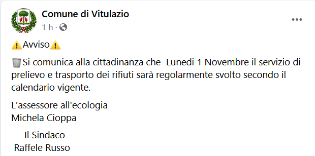 Questo il post pubblicato sulla pagina Facebook del Comune di Vitulazio: "Si comunica alla cittadinanza - si legge nel post - che Lunedi 1 Novembre il servizio di prelievo e trasporto dei rifiuti sarà regolarmente svolto secondo il calendario vigente. L'assessore all'ecologia Michela Cioppa. Il Sindaco Raffele Russo".