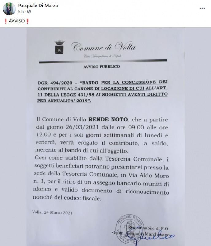 Questo quanto apprendiamo dalla pagina facebook del Sindaco Di Marzo: