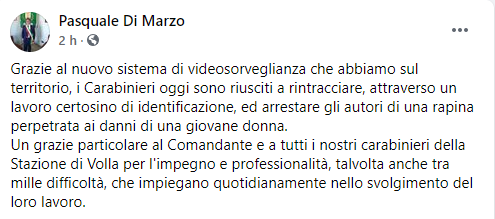 Questo il post pubblicato sulla sua pagina Facebook dal Sindaco di Volla Pasquale Di Marzo: "Grazie al nuovo sistema di videosorveglianza che abbiamo sul territorio - si legge nel post - i Carabinieri oggi sono riusciti a rintracciare, attraverso un lavoro certosino di identificazione, ed arrestare gli autori di una rapina perpetrata ai danni di una giovane donna. Un grazie particolare al Comandante e a tutti i nostri carabinieri della Stazione di Volla per l'impegno e professionalità, talvolta - conclude il post - anche tra mille difficoltà, che impiegano quotidianamente nello svolgimento del loro lavoro".