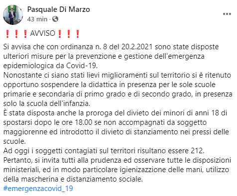 Questo il post pubblicato dal Sindaco di Volla Pasquale Di Marzo sulla sua pagina Facebook: "Si avvisa che con ordinanza n. 8 del 20.2.2021 sono state disposte ulteriori misure per la prevenzione e gestione dell'emergenza epidemiologica da Covid-19. Nonostante ci siano stati lievi miglioramenti sul territorio - si legge nel post - si è ritenuto opportuno sospendere la didattica in presenza per le sole scuole primarie e secondaria di primo grado e di secondo grado, in presenza solo la scuola dell'infanzia. È stata disposta anche la proroga del divieto dei minori di anni 18 di spostarsi dopo le ore 18.00 se non accompagnati da soggetto maggiorenne ed introdotto il divieto di stanziamento nei pressi delle scuole. Ad oggi i soggetti contagiati sul territori risultano essere 212. Pertanto - conclude il post - si invita tutti alla prudenza ed osservare tutte le disposizioni ministeriali, ed in modo particolare igienizazzione delle mani, utilizzo della mascherina e distanziamento sociale".