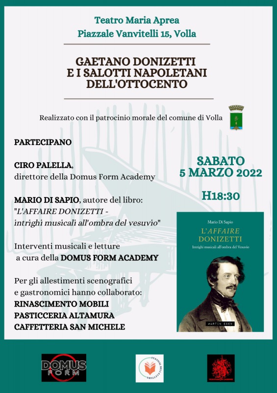 Questo il comunicato stampa diffuso dal Teatro Aprea di Volla: "Nella prima metà dell’800 Napoli, capitale europea, vede affermarsi una serie di elementi che caratterizzeranno poi il suo sviluppo economico e culturale: la canzone napoletana, l’editoria musicale, il giornalismo letterario e politico, il turismo e l’industria del tempo libero - si legge nel comunicato - la raffinatezza gastronomica. Contestualmente nei salotti della buona società napoletana, le salonnières ricevevano l’aristocrazia, la burocrazia, i possidenti, i professionisti, gli artisti di grido, e tra feste e ricevimenti - si legge ancora - si tessevano intrighi e alleanze politiche, si concludevano affari, si intrecciavano relazioni amorose, si combinavano matrimoni e si creavano e disfacevano patrimoni e posizioni sociali. “Dopo un lungo periodo di silenzio artistico e culturale, torniamo con un evento di alto profilo”, così il direttore della DOMUS FORM ACADEMY Ciro Palella, accoglie i prossimi appuntamenti al ‘Maria Aprea’. “Questo evento era proprio quello che ci voleva per tornare a parlare ancora di musica e cultura”. Il 5 marzo Mario Di Sapio presenterà il libro “L’Affaire Donizetti – intrighi musicali all’ombra del Vesuvio”: “Questa iniziativa – spiega l’autore – nasce con lo scopo - si legge ancora - di approfondire alcuni aspetti storici e culturali ed unire tutti gli appassionati di musica e di lettura del territorio vesuviano”.