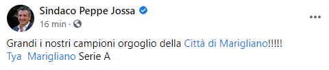Questo il post pubblicato sulla sua pagina Facebook dal Sindaco di Marigliano Giuseppe Jossa: "Grandi i nostri campioni - si legge nel post - orgoglio della Città di Marigliano!!!!! Tya Marigliano Serie A".