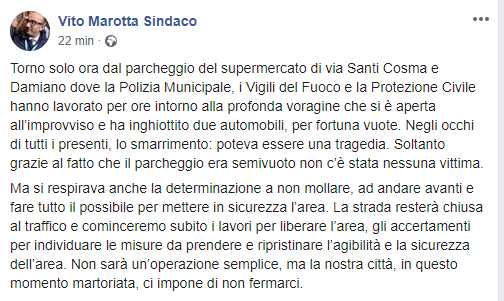 "Torno solo ora dal parcheggio del supermercato di via Santi Cosma e Damiano dove la Polizia Municipale, i Vigili del Fuoco e la Protezione Civile hanno lavorato per ore intorno alla profonda voragine che si è aperta all’improvviso e ha inghiottito due automobili, per fortuna vuote. Negli occhi di tutti i presenti, lo smarrimento: poteva essere una tragedia. Soltanto grazie al fatto che il parcheggio era semivuoto non c’è stata nessuna vittima. Ma si respirava anche la determinazione a non mollare, ad andare avanti e fare tutto il possibile per mettere in sicurezza l’area. La strada resterà chiusa al traffico e cominceremo subito i lavori per liberare l’area, gli accertamenti per individuare le misure da prendere e ripristinare l’agibilità e la sicurezza dell’area. Non sarà un’operazione semplice, ma la nostra città, in questo momento martoriata, ci impone di non fermarci."