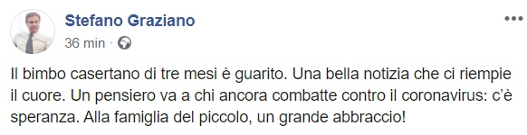 "La bimba casertana (originaria della zona atellana ndr.) di tre mesi è guarita. Una bella notizia che ci riempie il cuore. Un pensiero va a chi ancora combatte contro il coronavirus: c’è speranza. Alla famiglia della piccola, un grande abbraccio!"
