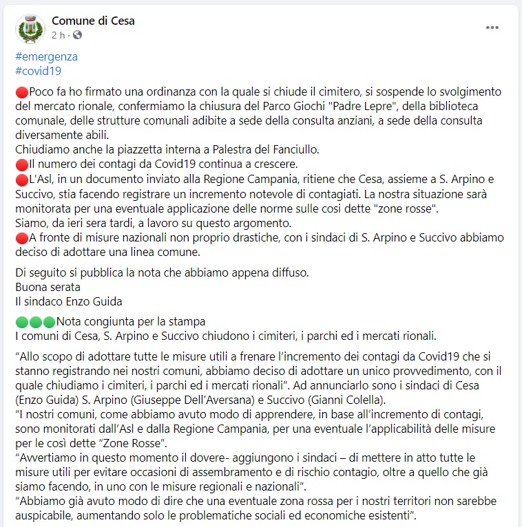 Questo quanto pubblicato sulla pagina FB del Comune di Cesa